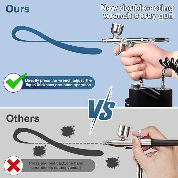 High Pressure (50 PSI): The airbrush kit offers a high-pressure setting of 50 PSI, which can be adjusted as needed. This high pressure is claimed to provide a professional painting experience including painting, model painting, makeup, cake decoration, temporary tattoos, and manicures. Portability: trigger air brush kit with air compressor comes with a belt and an air hose, providing users with the flexibility to move around and perform tasks without being constrained. Comprehensive Kit Contents: The package includes various components such as the airbrush gun, compressor, belt, air hose, wash needles, cleaning brushes, different capacity cups, liquid extraction dropper, adjustment wrench, USB-C charging cable, and a user manual. Performance and Comfort: The airbrush gun is designed to balance spraying performance with an ergonomically designed grip. The pistol trigger design is said to reduce hand fatigue during prolonged use. The kit includes a 0.5mm needle nozzle set and replaceable fluid cups of different capacities to meet various usage needs.