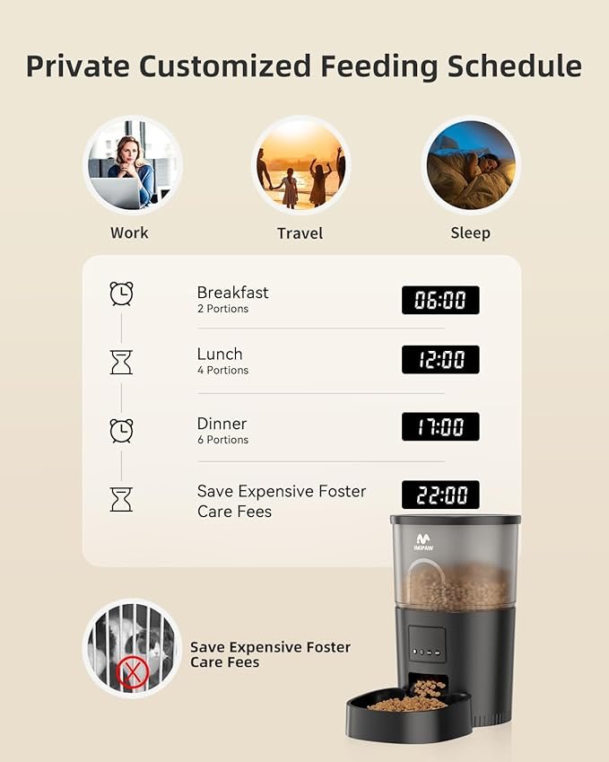 Simple Operation, Multiple Choices: The cat feeder automatic embrace the convenience of app control while retaining manual operation flexibility. Add food at your convenience and keep your pet’s dining routine seamless. Quality Assurance for Peace of Mind: With a 1-year warranty, we provide quality assurance to accompany your purchase. The IMIPAW cat food dispenser is more than just a smart product; it’s a testament to our commitment to your pet’s well-being and happiness.
