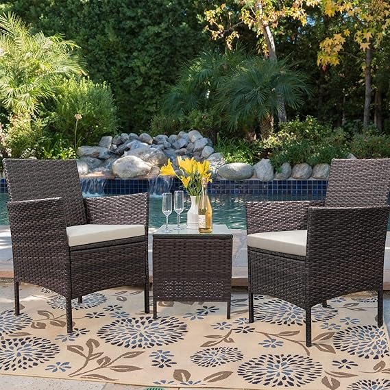 Devoko rattan patio furniture set is made of brown PE rattan and strong steel frame, It is durable enough to withstand rain and wind for long time using. Featuring sturdy construction and durable rattan, this porch furniture set can withstand the test of time and high temperature. Soft sponge-filled seats give you extra comfort, and the covers can be removed for easy clean and maintain. Toughened glass is strong and light, which can be swabbed or washed with water. Good choice for patio, porch, backyard, balcony, poolside, garden and other suitable space in your home, which perfect for indoor & outdoor using and meet the purpose of decorating the leisure places you need. Assemble easily and no need to maintenance, no worry to split, crack, fade, rot and deteriorate. If you have any assemble questions with products, please contact us by Amazon message, we will answer your questions ASAP. and meet the purpose of decorating the leisure places you need.