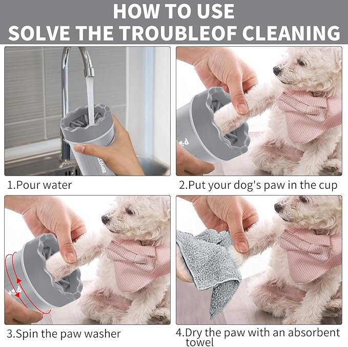 This is a paw cleaner specially designed for small pet dogs or cats, no need to fix dog paws, suitable for small dogs such as Yorkshire, Chihuahua, Mini Poodle, and also suitable for large dogs puppy period The dog paw washer with lanyard uses environmentally friendly silicone bristles, soft and high density, which can effectively clean dog paw dirt and mud keep the floor clean. And don’t worry about the dog’s paw feeling any discomfort comfortable Pour clean water into the cup 2. Put the dog’s paws into the cup 3. Rotate the cup for a while to remove dirt from the paws 4. Repeat for the remaining three paws