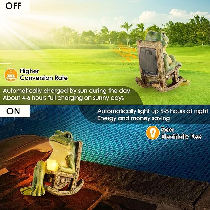 The frogs statue lights combine the charming elements of the animal with the beauty of light. The simple , modern design blends unobtrusively into the living room etc and provides cozy light for an individual living ambience . The lamp completes the living area as a pretty accent light. Brighten up an entryway or bedroom with these charming handmade coffee loving frog statue decor that are also great conversation pieces. Simply place it at a location with direct sunlight during the day, the solar panel will charge within 4-6 hours during the day and light up automatically at night for 6-8 hours. This is good for the environment and your wallet. This chic Lawn Frog Ornaments light will stay with you for a long time and will give you a lot of pleasure. Our mini fairy garden accessories yard decor are made of high quality resin material, waterproof,cracking and fade resistant could work well even in heavy rain or snowstorms.