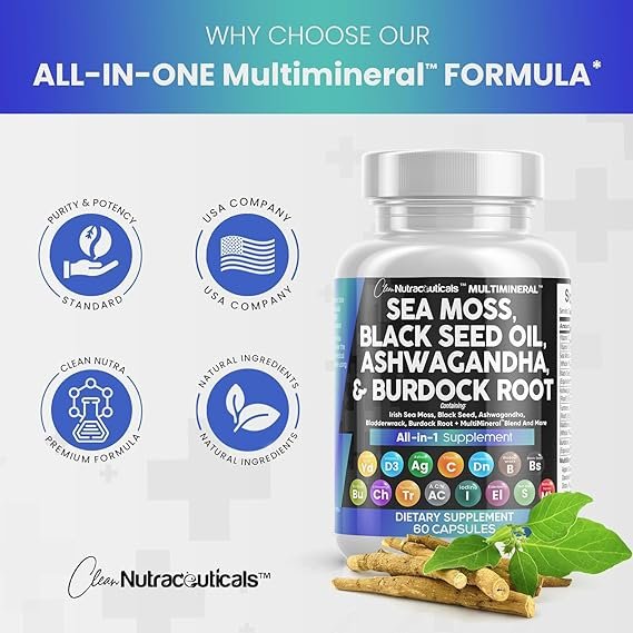| Primary Supplement Type | Black Seed Oil, Bladderwrack, Sea Moss, Ashwagandha, Burdock Root |